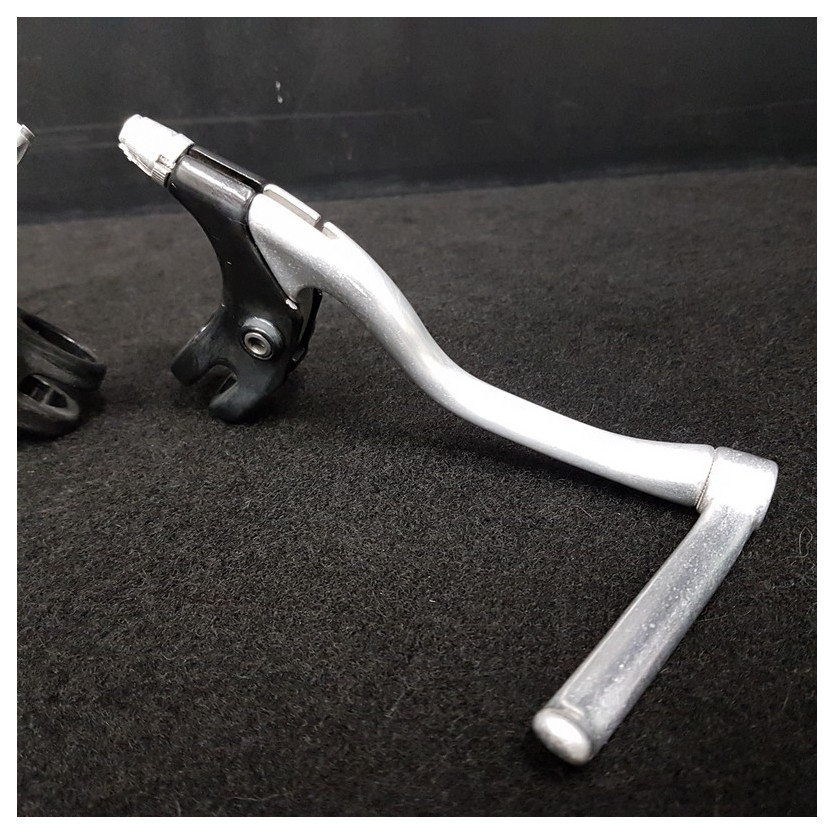 Coppia di leve freno di tipo MTB, modello con disassamento laterale per la presa sulle estremità del manubrio.